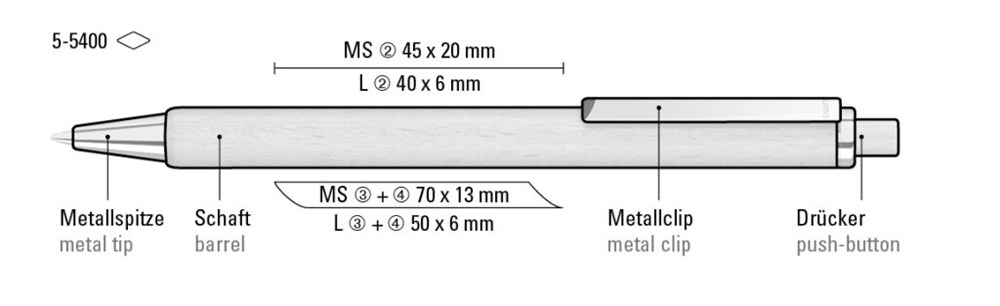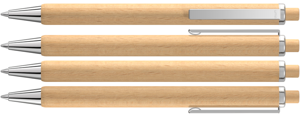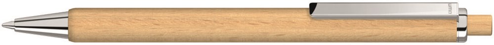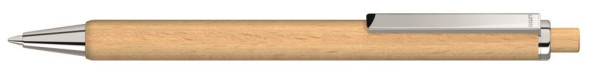 Holz-Druckkugelschreiber mit Holzdrücker, Metallclip und Metallspitze glanzverchromt. Schaft und Drücker aus schutzlackiertem PEFC-zertifiziertem Buchenholz.