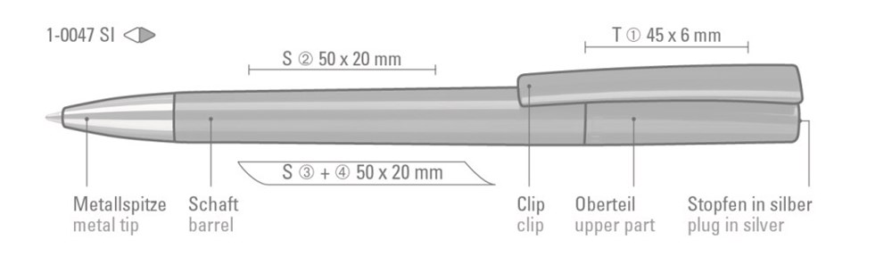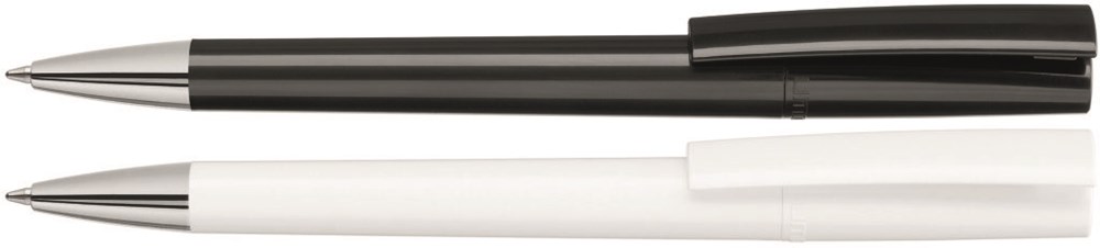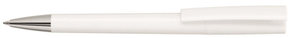 Drehkugelschreiber mit gedeckt glänzendem Gehäuse in weiß oder schwarz und silbernem Stopfen im Oberteil. Schwere Metallspitze glanzverchromt.