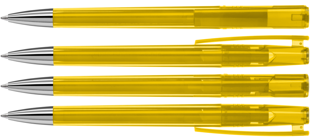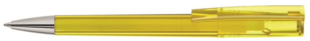 Drehkugelschreiber mit transparent glänzendem Gehäuse und silbernem Stopfen im Oberteil. Schwere Metallspitze glanzverchromt.