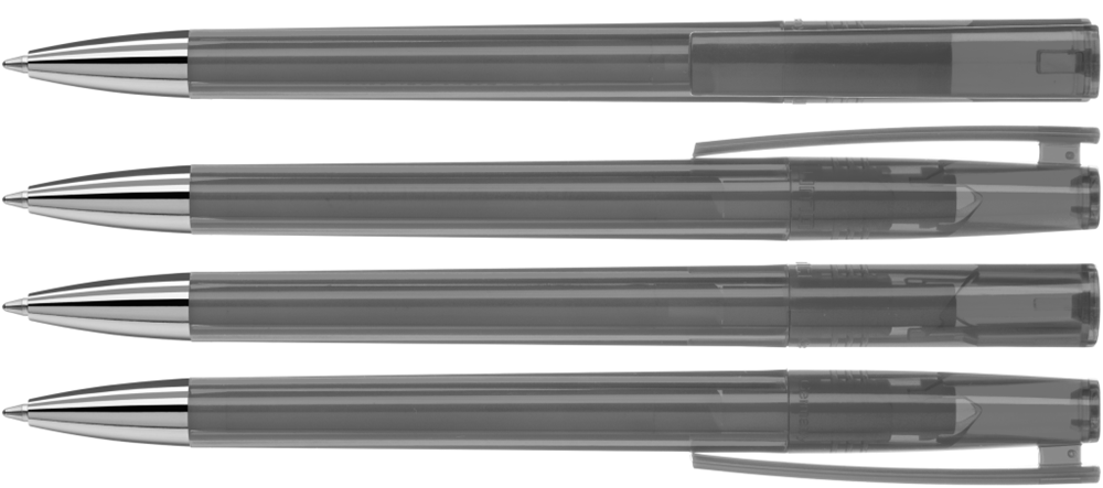 Drehkugelschreiber mit transparent glänzendem Gehäuse und silbernem Stopfen im Oberteil. Schwere Metallspitze glanzverchromt.