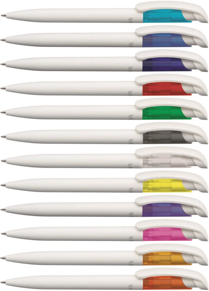 Druckkugelschreiber mit Gehäuse und Clip aus 100% nachwachsendem und kompostierbarem Material. Oberteil aus gefrostetem ABS Kunststoff.