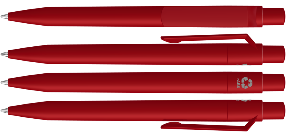 Druckkugelschreiber mit gedeckt mattem Gehäuse, Clip, Drücker und Stopfen aus recyceltem ABS-Kunststoff.