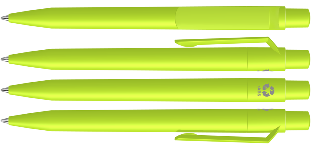 Druckkugelschreiber mit gedeckt mattem Gehäuse, Clip, Drücker und Stopfen aus recyceltem ABS-Kunststoff.