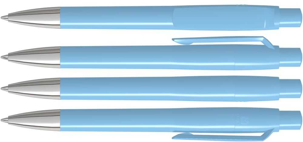 Druckkugelschreiber mit gedeckt glänzendem Gehäuse, Clip, Drücker und Stopfen. Spitze glanzverchromt.