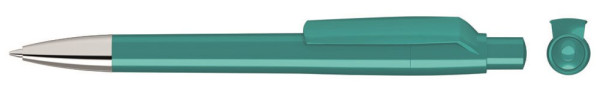 Druckkugelschreiber mit gedeckt glänzendem Gehäuse, Clip, Drücker und Stopfen. Spitze glanzverchromt.