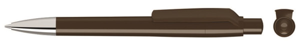 Druckkugelschreiber mit gedeckt glänzendem Gehäuse, Clip, Drücker und Stopfen. Spitze glanzverchromt.