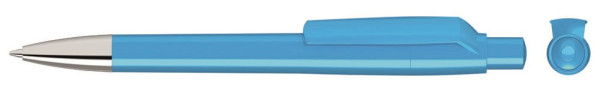Druckkugelschreiber mit gedeckt glänzendem Gehäuse, Clip, Drücker und Stopfen. Spitze glanzverchromt.
