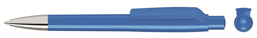 Druckkugelschreiber mit gedeckt glänzendem Gehäuse, Clip, Drücker und Stopfen. Spitze glanzverchromt.