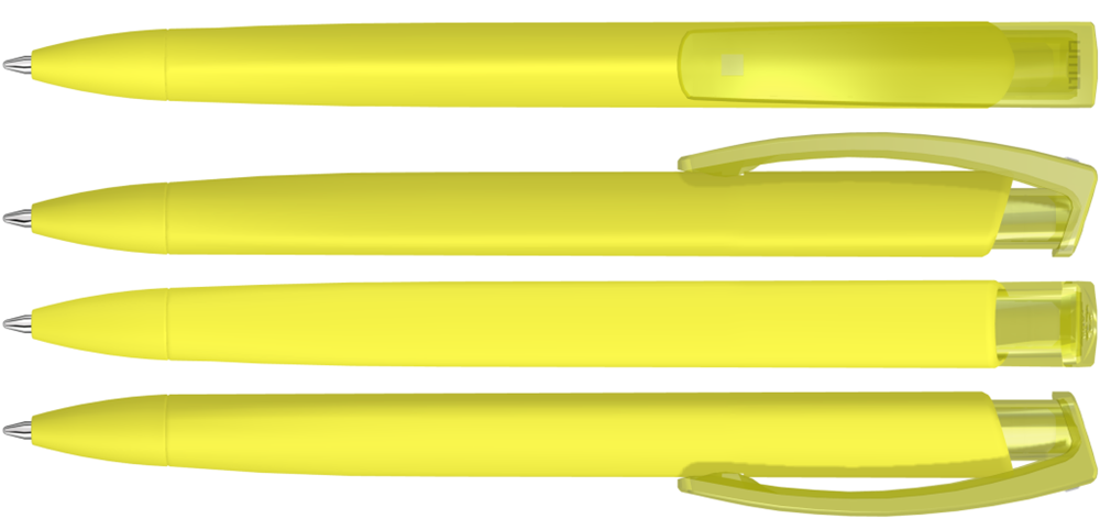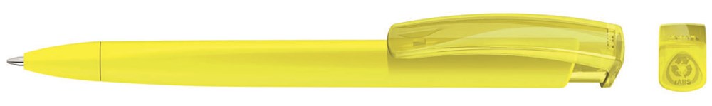 Druckkugelschreiber mit gedeckt mattem Dreikantgehäuse und transparent glänzendem Clip aus recyceltem ABS Kunststoff. Das Modell ist mit dem Recyclingzeichen gekennzeichnet.