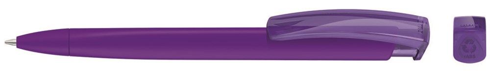 Druckkugelschreiber mit gedeckt mattem Dreikantgehäuse und transparent glänzendem Clip aus recyceltem ABS Kunststoff. Das Modell ist mit dem Recyclingzeichen gekennzeichnet.