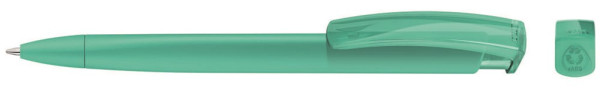 Druckkugelschreiber mit gedeckt mattem Dreikantgehäuse und transparent glänzendem Clip aus recyceltem ABS Kunststoff. Das Modell ist mit dem Recyclingzeichen gekennzeichnet.