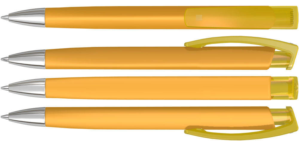 Druckkugelschreiber mit gedeckt mattem Dreikantgehäuse, transparent glänzendem Clip aus recyceltem ABS Kunststoff und schwerer Metallspitze glanzverchromt. Das Modell ist mit dem Recyclingzeichen gekennzeichnet.