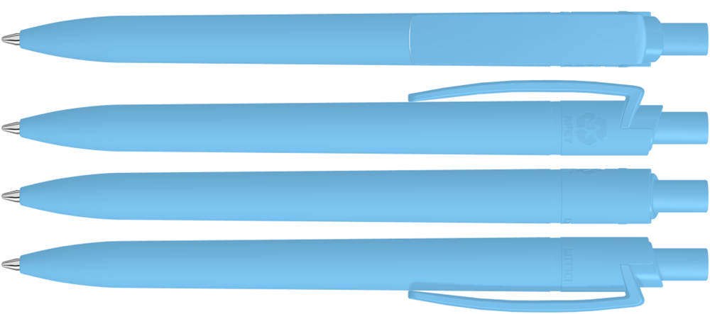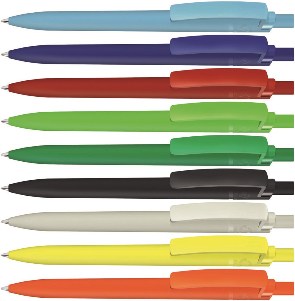 Druckkugelschreiber mit gummiertem Gehäuse aus recyceltem PET-Material mit matt gedecktem Clip und Drücker.