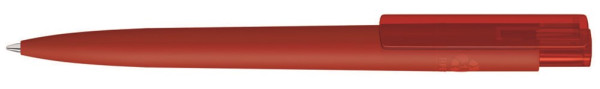 Druckkugelschreiber mit gummiertem Gehäuse aus recyceltem PET-Material mit transparent glänzendem Clip.