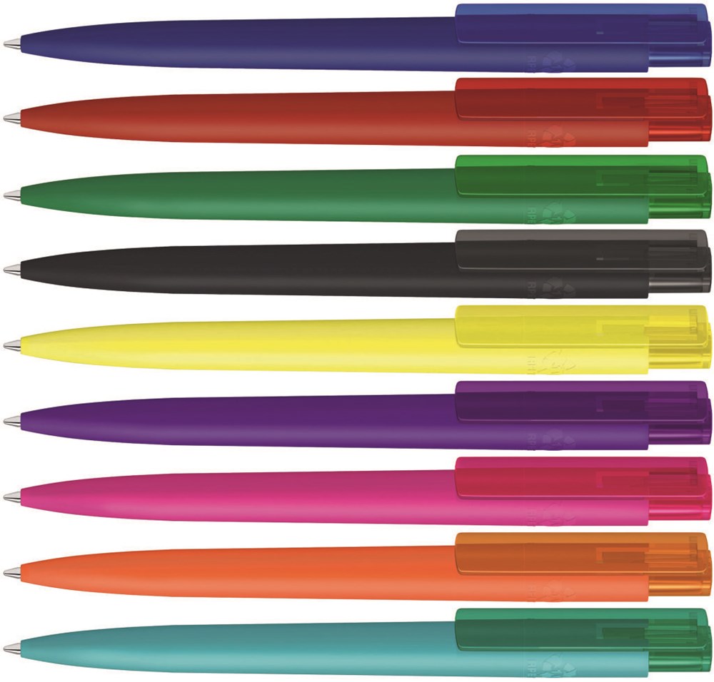 Druckkugelschreiber mit gummiertem Gehäuse aus recyceltem PET-Material mit transparent glänzendem Clip.
