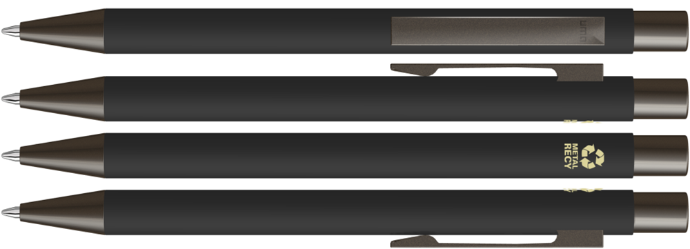Metall-Druckkugelschreiber mit Softtouch-Gehäuse aus recyceltem Metall. Metallclip, Metallspitze und Drücker GUN metallic.