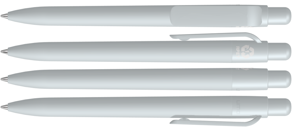 Druckkugelschreiber aus recyceltem PET-Material mit gummiertem Gehäuse und gedeckt mattem Clip, Drücker und Stopfen.