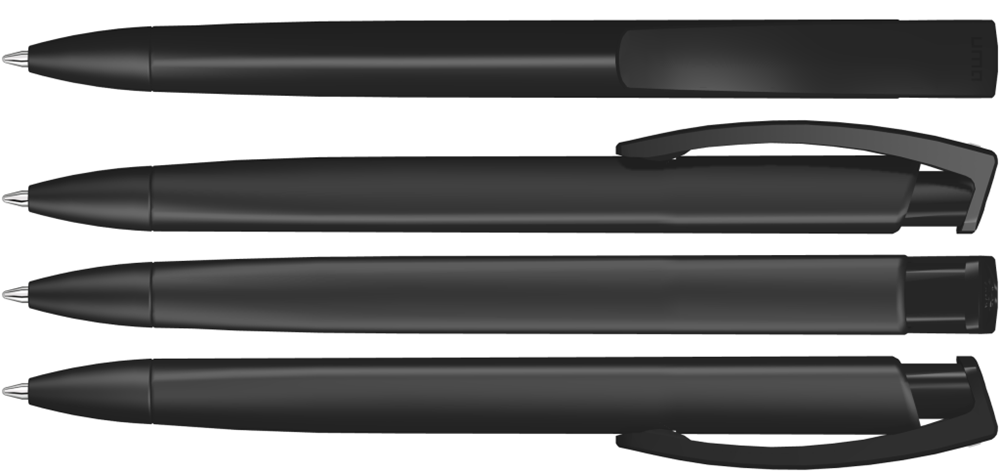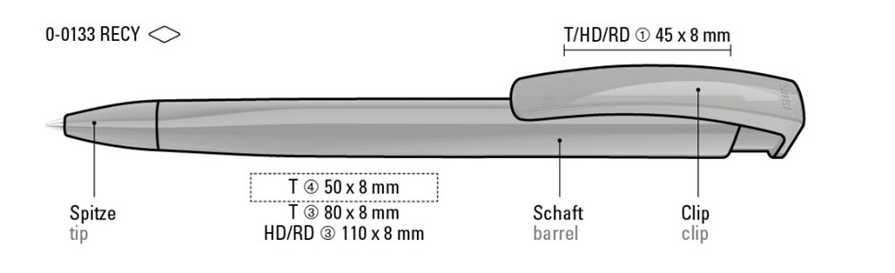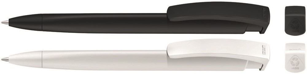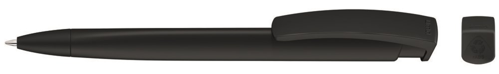 Druckkugelschreiber mit gedeckt mattem Dreikantgehäuse und glänzendem Clip aus recyceltem ABS Kunststoff. Das Modell ist mit dem Recyclingzeichen gekennzeichnet.