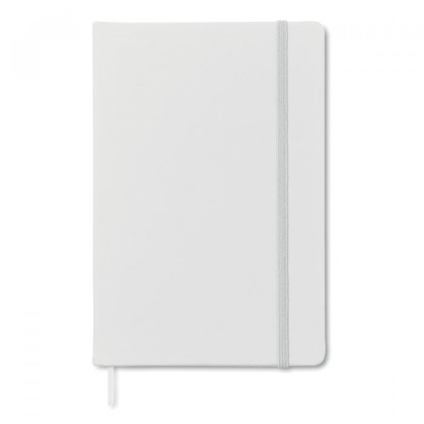 DIN A5 Notizbuch mit gebundenem Hard-Cover aus PU. 96 Blatt (192 Seiten) recyceltes Blankopapier. Elastisches Verschlussband und Lesebändchen.