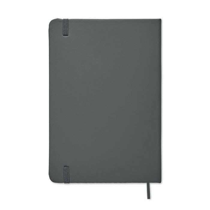 DIN A5 Notizbuch mit gebundenem Hard-Cover aus PU. 96 Blatt (192 Seiten) recyceltes Blankopapier. Elastisches Verschlussband und Lesebändchen.