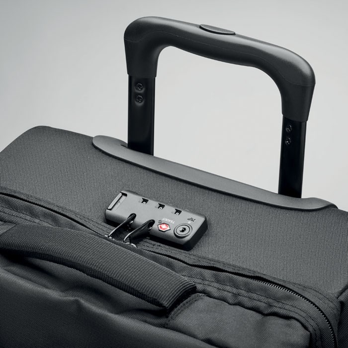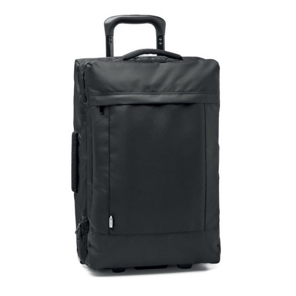 Trolley aus 600D RPET Polyester. Doppelrohrrahmen. Zwei große Innenfächer mit Reißverschluss. Fronttasche mit Reißverschluss. Tragegriffe oben, unten und seitlich. Mit integriertem Zahlenschloss. 2 Rollen.