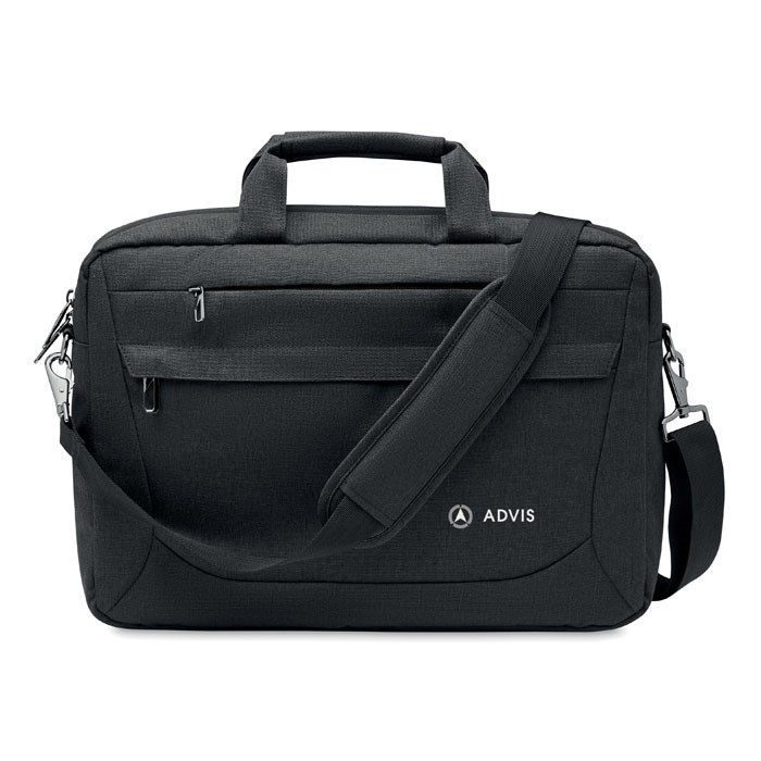 15'' Laptop-Tasche aus 600D RPET Polyester. 2 Hauptfächer für Laptop und Tablet sowie große Frontreißverschlusstasche. Kleine Tasche mit Reißverschluss. Abnehmbare und verstellbare Schultergurte. Trolley- Halterung.