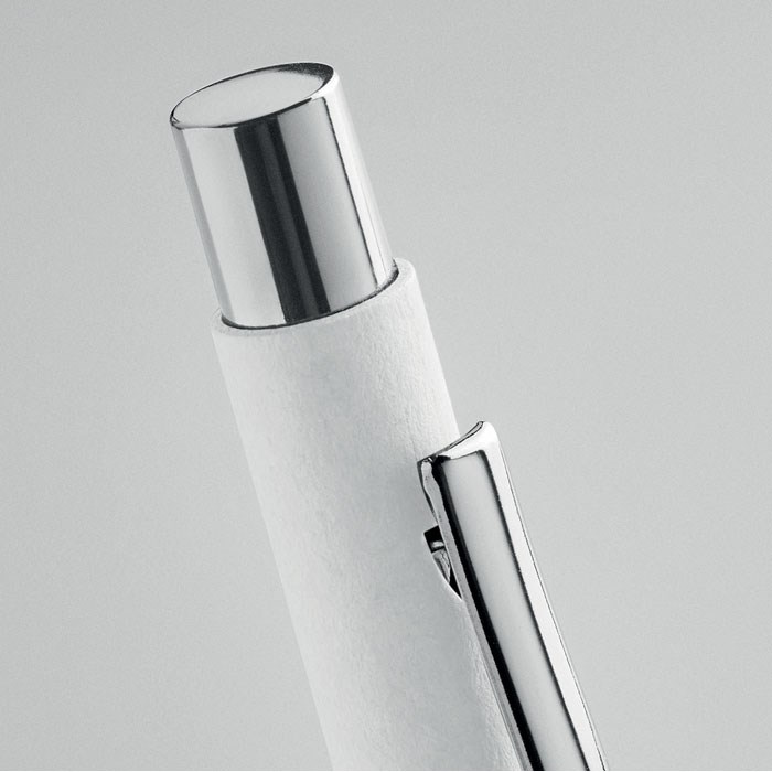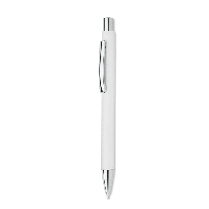 Druckkugelschreiber aus recyceltem Papier, Metallclip und Details aus Kunststoff. Blaue Tinte.