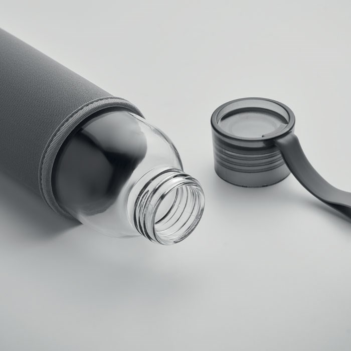 Trinkflasche aus recyceltem Glas mit Neopren-Schutzhülle und PP-Deckel mit Silikon-Schlaufe. Auslaufsicher. Füllmenge: 500 ml.