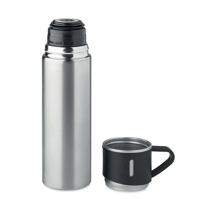 Set bestehend aus doppelwandiger Isolierflasche sowie 1 passenden Becher. Der Becher kann als Deckel genutzt werden. Edelstahl. Füllmenge: Flasche 420 ml, Becher 150 ml.