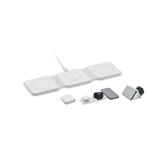 Zusammenfaltbare Ladestation 3in1. ABS. Sie verfügt über 3 kabellose Ladepunkte. Eingang: 2-in-1 Typ-C und Typ-A. 15 W. Kompatibel mit allen QI-fähigen Geräten wie den neuesten Android Smartphones, iPhone® 8 und X und höher. Auch kompatibel mit der iWatch.