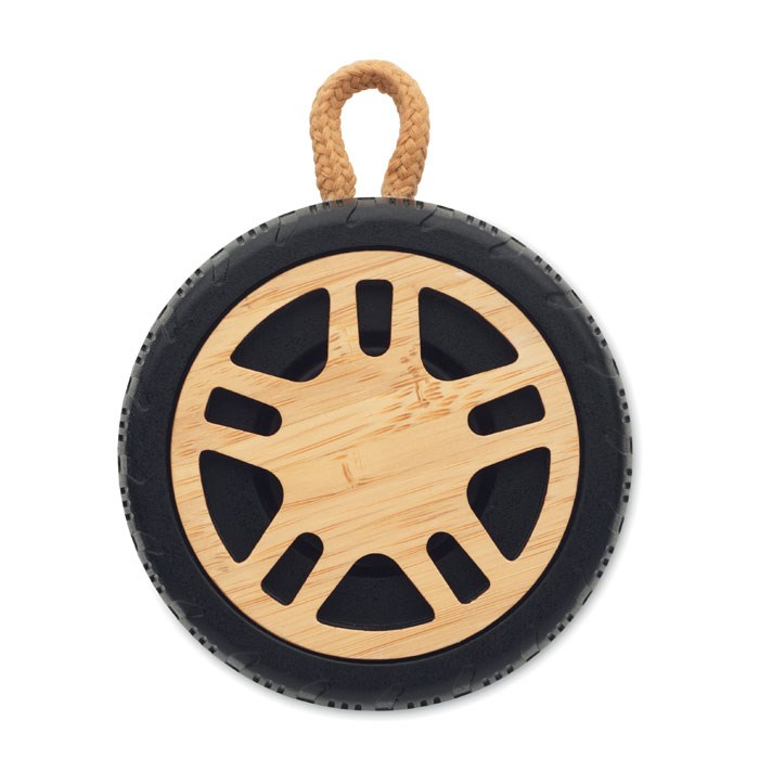 5.3 wireless Lautsprecher (3W) in Optik eines Autoreifens. Recyceltes ABS mit Details aus Bambus. Handschlaufe aus Baumwolle. Inkl. 1 wiederaufladbare 400-mAh-Batterie.