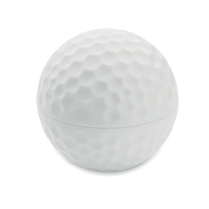 Lippenbalsam in rundem Behälter aus ABS. Optik: Golfball. SPF10. Aroma: Vanille. mehr