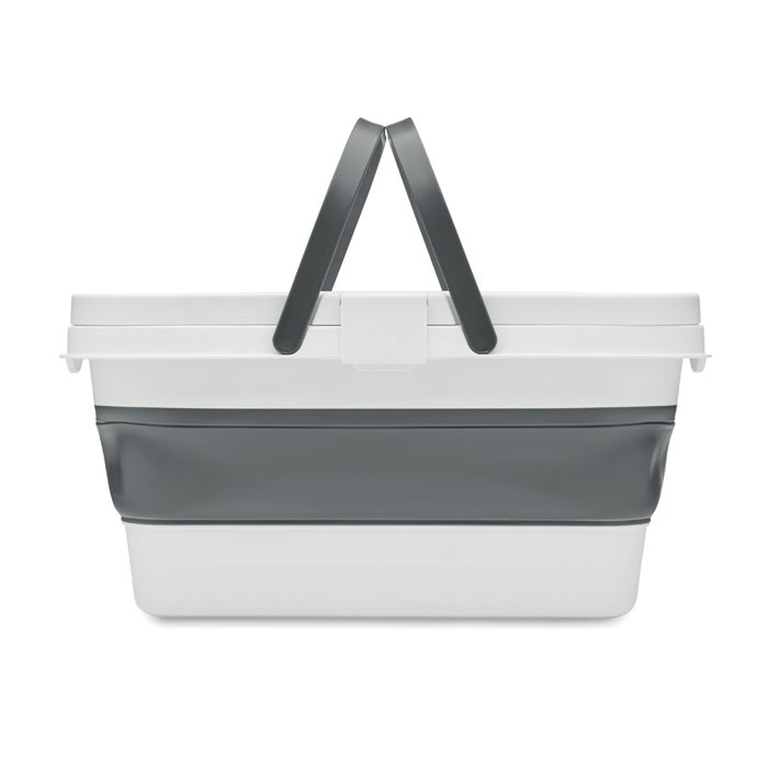 Faltbarer Picknickkorb aus Silikon mit Deckel aus PP. Der Deckel dient als Ablagefläche. Ohne Zubehör. Füllmenge: 16 l.
