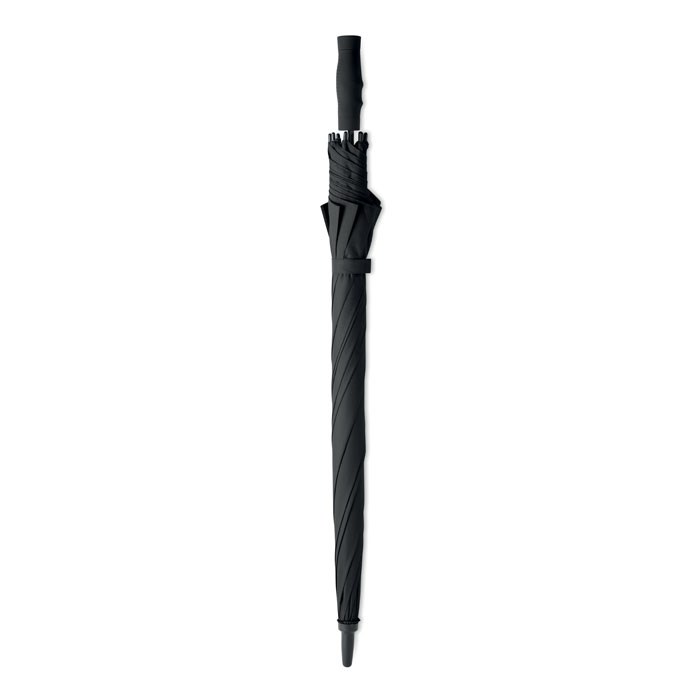 27'' Regenschirm aus 190T Pongee. Windbeständig. Stock und Stangen aus Fiberglas. Schwarze Krone und Spitzen aus Kunststoff. Schwarzer Griff aus ABS mit gummiertem Finish. Automatische Öffnung, manuelle Schließung.