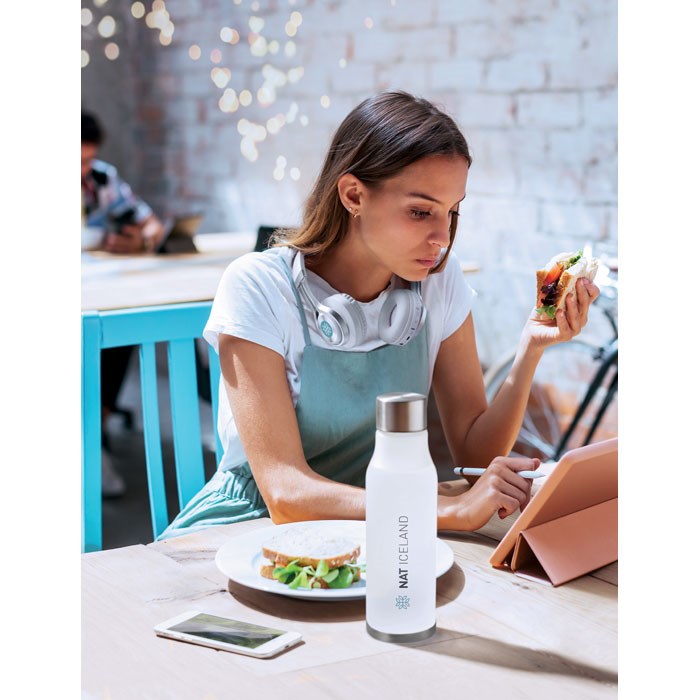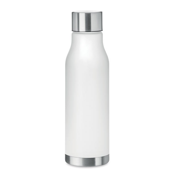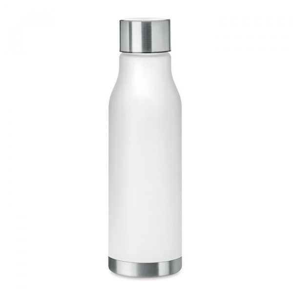 Trinkflasche aus RPET mit gummierten Finish und Verschluss aus Edelstahl mit RPET im Inneren und Silikon Dichtungsring. BPA frei. Füllmenge: 600 ml. Nicht geeignet für kohlensäurehaltige Getränke. Auslaufsicher.