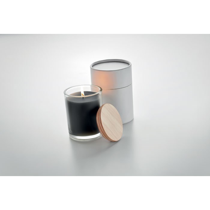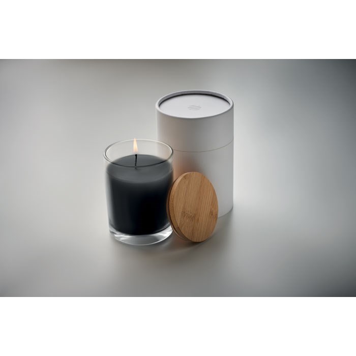 Wachskerze auf pflanzlicher Basis im Glas. Deckel aus Bambus. Aroma: Vanille. Verpackt in einem Papierschuber. Ø 8cm. Brenndauer: 40 Stunden. 240g.