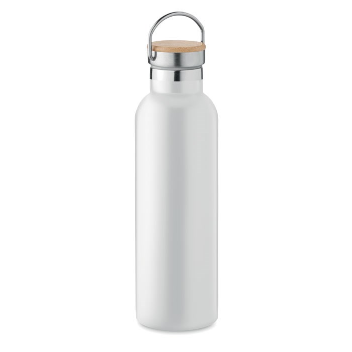 Doppelwandige Isolierflasche aus Edelstahl mit Bambusdeckel und Henkel. Füllmenge: 750 ml. Auslaufsicher. Bambus ist ein natürliches Produkt, es kann daher zu leichten Abweichungen in Farbe, Dekor und Maßen kommen.