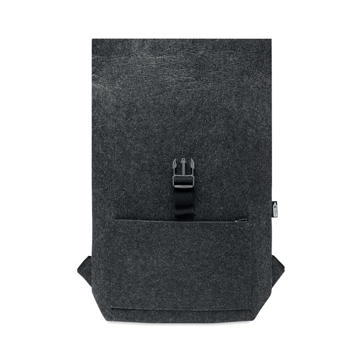 Rucksack aus RPET-Filz mit Laptop-Fach. Reißverschlusstasche auf der Vorderseite, Verschlussgurt aus Baumwolle.