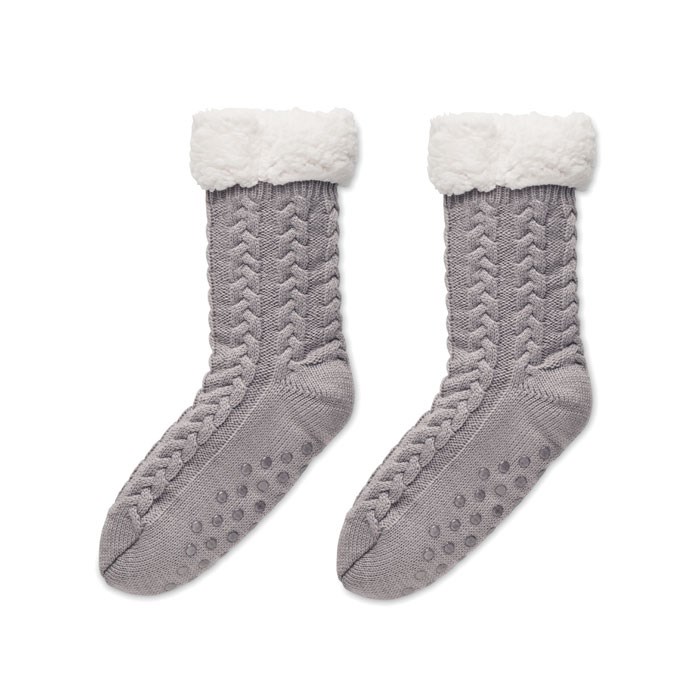 Socken mit Zopfstrickmuster und Anti-Rutsch-Sohle. Acrylgarn mit Sherpa- Futter 240 g/m². Lieferung in Hülse aus Papier. Größe M entspricht 36-39.