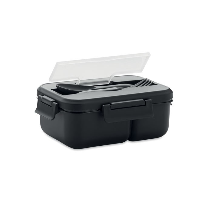 Lunchbox aus PP mit 2 Ebenen. Inkl. passendem Besteck und Henkel. Füllmenge gesamt: 1000 ml