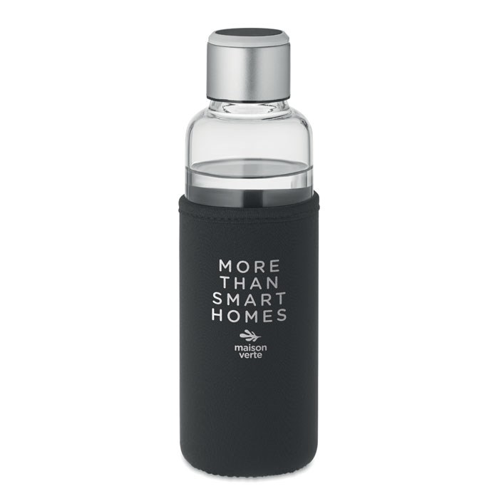 Trinkflasche aus Borosilikatglas mit Trink-Erinnerung. Das Sensorlicht leuchtet stündlich auf und erinnert Sie daran etwas zu trinken. Mit Schutzhülle. Inkl. 1 CR2032-Batterie. Füllmenge: 500 ml.