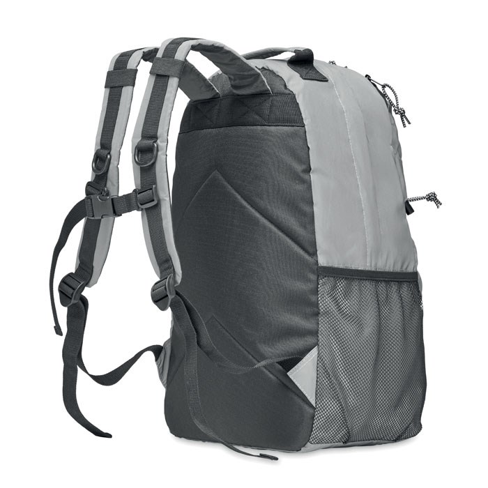 Rucksack aus reflektierendem 190T Polyester mit Schnürung auf der Vorderseite. 15'' Laptopfach. Seitliche Netztasche und Tasche mit Reißverschluss. Gepolsterter Rücken, Schultergurte und Boden.