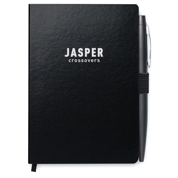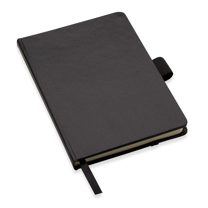 DIN A6 Notizbuch mit Hard Cover aus PU und 72 Blatt (144 Seiten) liniertem Papier. Elastisches Verschlussband und Lesebändchen. Mit passendem Druckkugelschreiber aus Metall. Blaue Tinte.