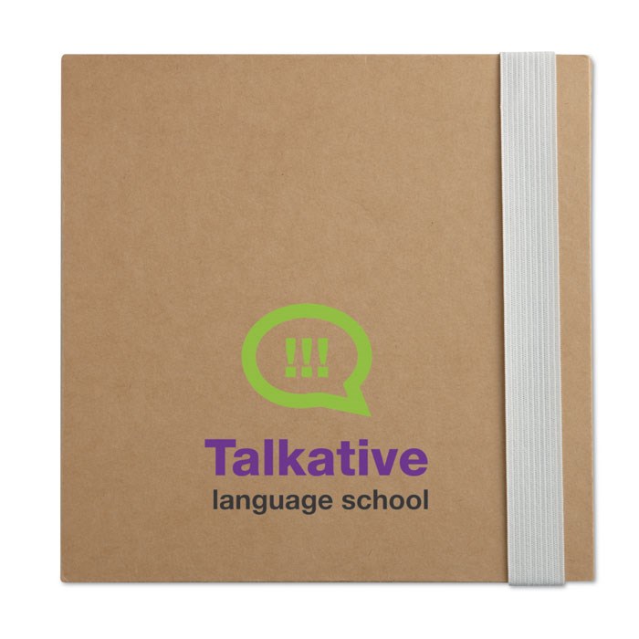 Notizbuch mit Cover aus recyceltem Karton. 100 Blatt Blanko-Recyclingpapier, 2 unterschiedlich große, gelbe Haftnotizblöcke und 5 farbige Markerblöcke. Mit passendem Druckkugelschreiber mit Schaft aus Papier. Stifthalter. Elastisches Verschlussband.