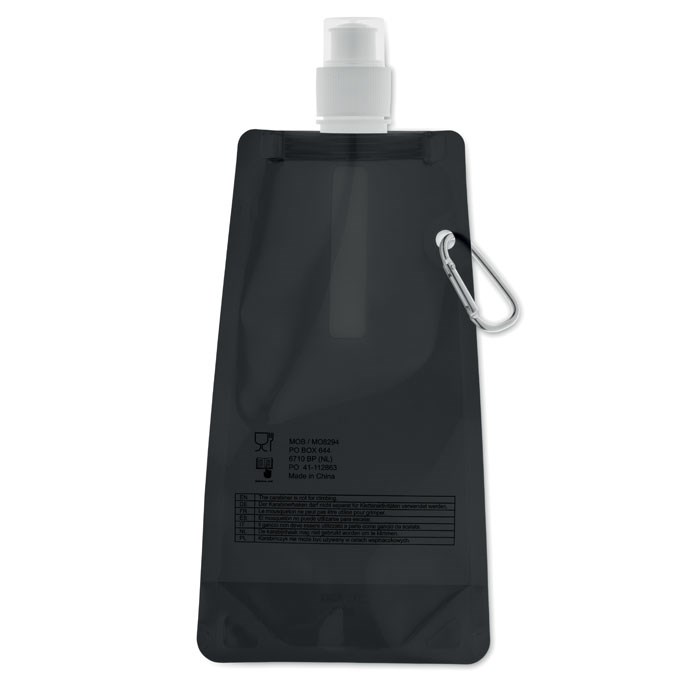 Faltbare Wasserflasche aus BPA freiem PET mit Alu-Karabiner. Füllmenge: 480 ml.