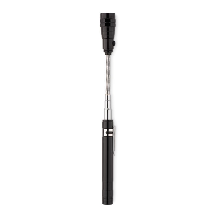 Teleskop Taschenlampe mit 3 LED Leuchten. Der obere Teil der Lampe ist flexibel und mit einem Magneten ausgestattet. Seitlicher Clip. Maximale Länge ausgezogen 57 cm. Inklusive 4 x LR44 Batterien.