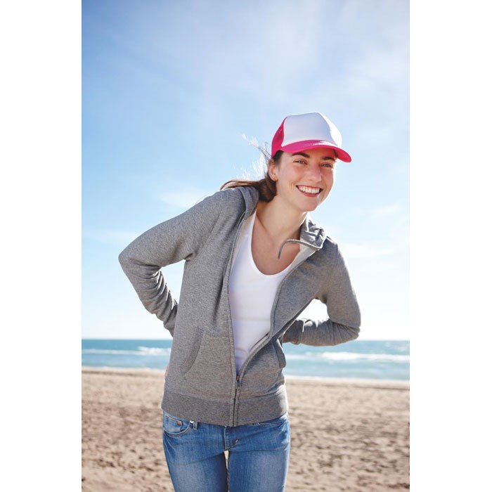Trucker Kappe. 5 Panele. 140-150 gr/m2 Polyester. Verstellbarer Kunststoffverschluss. Weißes Frontpanel, farbiger Kappenschirm aus Polyester Jersey mit Schaum-Verstärkung. Weitere Panele aus Mesh. Größe 7 1/4.