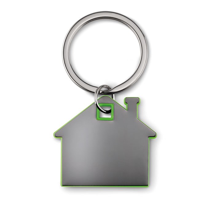 Schlüsselring mit Anhänger in Optik eines Hauses aus Edelstahl und Kunststoff.