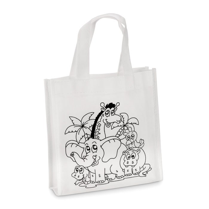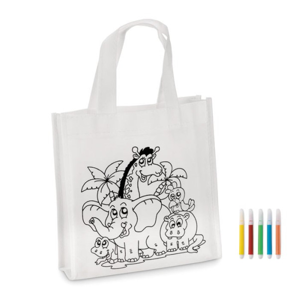 Mini-Shopping Tasche für Kinder mit 5 Filzstiften. Zum selbst gestalten. Non Woven PP / PET 80g/m². Nicht waschbar.