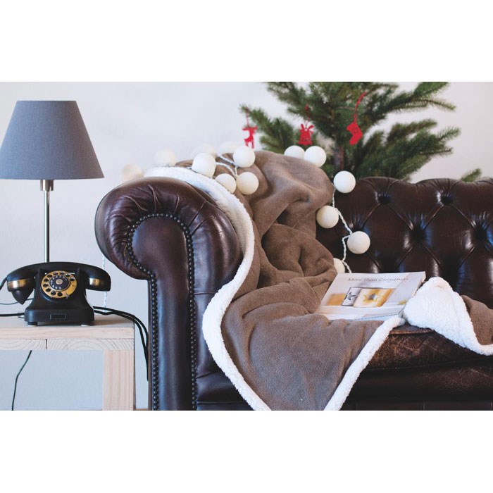 Coral Fleece Decke 200 g/m². Rückseite in Schafsplüsch-Optik aus 220 g/m² Polyester Sherpa. Inkl. Band mit bedruckbarer Karte.